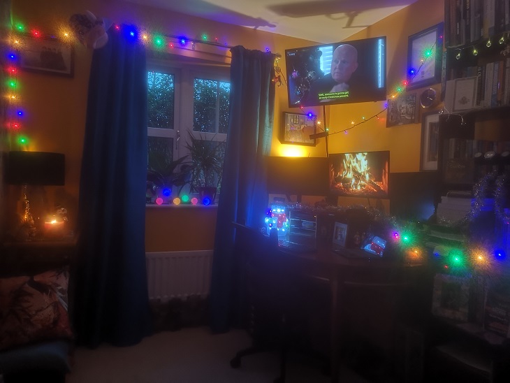 In the spirit of the festive period I add this post with a blanket on my lap, a cat on the blanket and my feet up on the desk surrounded by seasonal lights and scents (see pics for further indication). It has been a genuinely great Christmas, my best for years. The main difference is that I’m feeling fit, strong and comparatively happy about the recent past and what’s to come next year. You can’t have a good Christmas if it’s bracketed by misery before and after. It hangs over you like a cloud and depletes your spiritual, mental and physical energy. Christmas in such circumstances is liable to become an exercise in distraction and/or a journey into oblivion rather than the celebration of all good things it’s meant to be. On this occasion it felt like there was much to celebrate – much to be thankful for – and that meant a good Christmas came easily. I’m mindful that many are struggling at the moment and I do not take a warm home, good friends and gifts under the tree for granted.